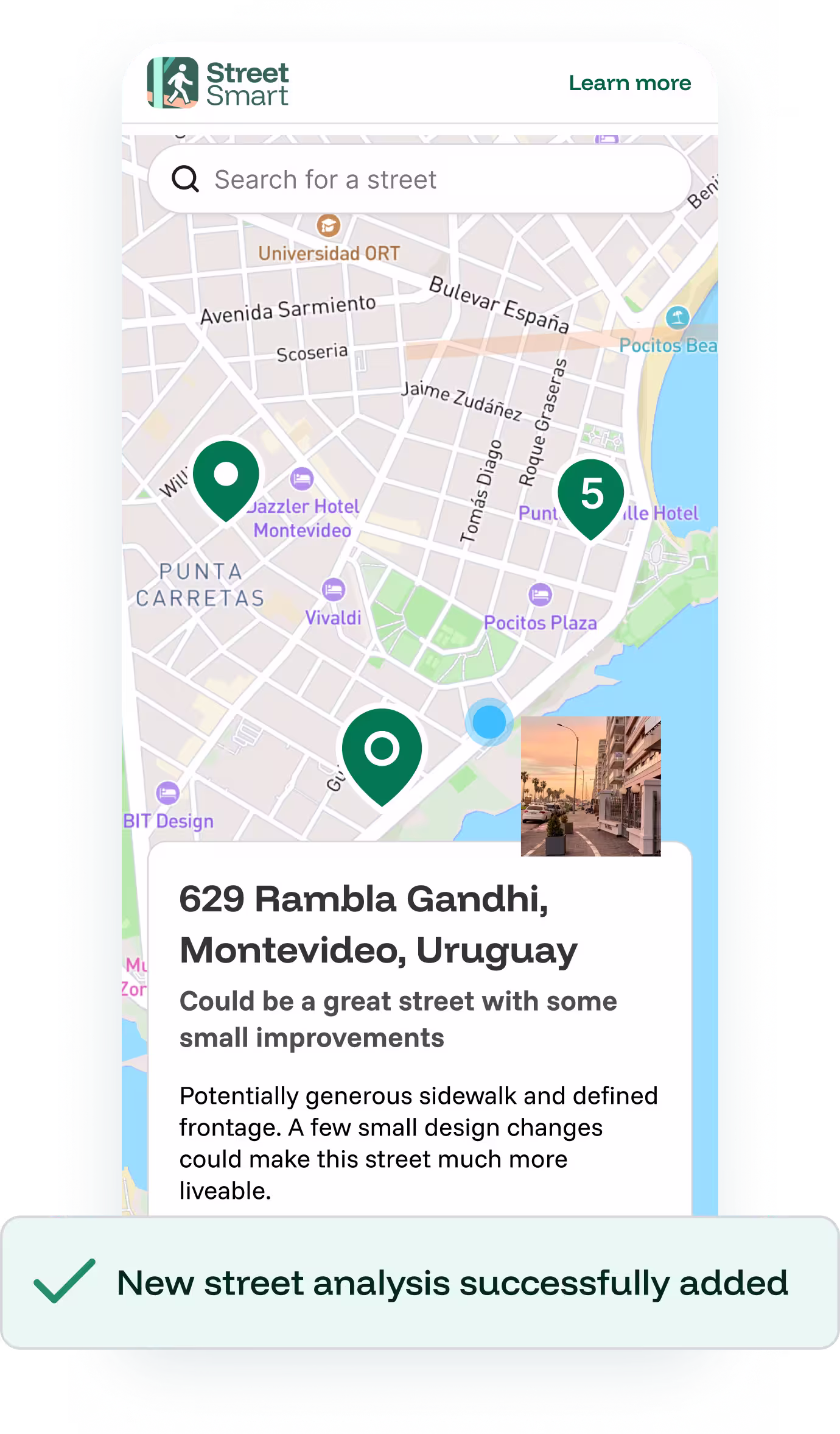 Upload a photo and StreetSmart gives you instant feedback. Want safer crossings? More shade?